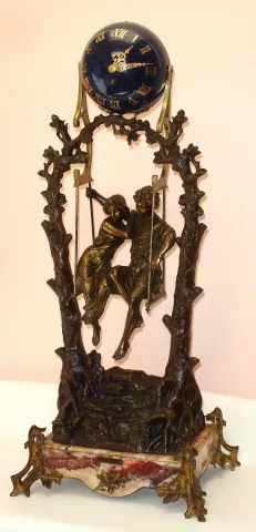 French, very large swing clock, Patinated spelter tree limbs entwined at the top to form the support for the swinging clock. A romantic couple are seated in a swing, appearing to suspend by rope, The original marble base with a brass title plaque: "Idylle