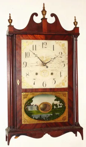 Mahogany veneered case in an old and possibly original finish. Scroll top is original with intact ears. Feet and front skirt are replacements. Tablet ...