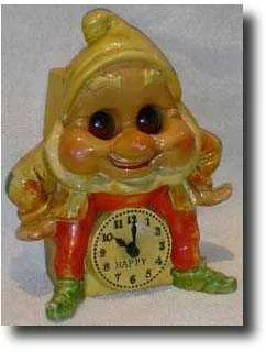 Figural blinking eye "Dwarf" novelty clock, c. 1930 Happy - in china with rolling eyes, one of a series based on Snow White and the Seven Dwarves. British c1930