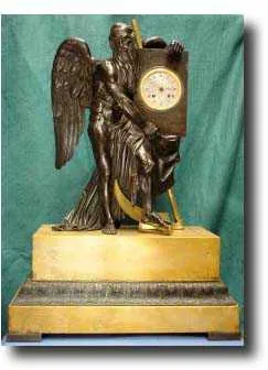 French bronze figural clock, c1820 Figural clock in bronze with sienna marble and bronze base, depicting Tempus or Old Father Time - with silk suspension, bell striking movement - 27"high. French c1820