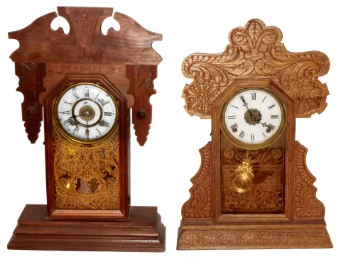Clocks- 2 (Two) gingerbread kitchen 8 day time and strike wood Connecticut mantel clocks, New Haven and Welch, late 19th century