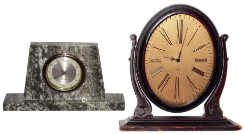 the oval Waltham, on its swivel stand, is in somewhat worn original condition and needs service, c1930, Ht 11". The heavy marble case is more recent a...