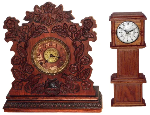 Clocks- 2 (Two) oak mantel: Gilbert Clock Co. 8 day time and strike cabinet, c1895; Foster Campos plug in miniature long case later 20th century