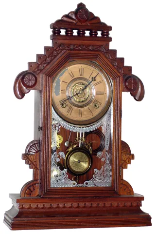 Gilbert Clock Co., Winsted, Conn, "Lebanon" walnut 8 day time, strike and alarm mantel clock, c1885