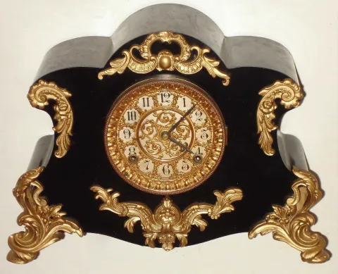 Ansonia Clock Co., New York, "Amiens" 8-day time and strike enameled iron mantel clock, c1904