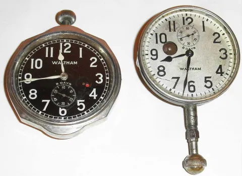 Clocks- 2 (Two) Waltham Watch Co. 37-size 7 jewel 8 day car clocks, c1915