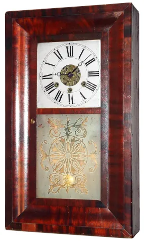 Mahogany veneered case in an old finish with some minor veneer chips on the corners and a veneer patch on bottom. Original painted dial with some loss...