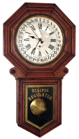 New Haven, New Haven, Conn., "Eclipse Regulator" oak 8 day time and calendar spring wound school clock, American Wringer label, c1910
