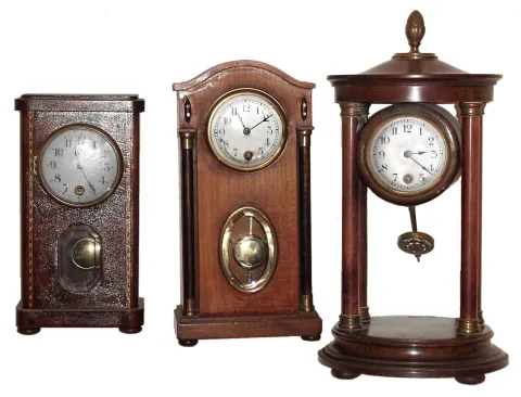 Clocks- 3 (Three) Hamburg American Clock Co. German small 8 day time only wood pendulum mantel clocks, c1900