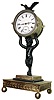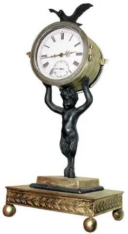 French figural desk clock with 30 hour Swiss pocket watch bar movement in a brass case with spelter figure of "Puck" or goat boy, and bird perched on top all resting on four ball feet, c1875