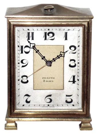Zenith Swiss heavy brass and glass small 8 day Deco style desk alarm clock, c1930