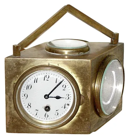 Charles Hour, French desk clock, thermometer, barometer and compass set with 8day, time only, spring driven movement in a diamond shaped brass case with triangular handle, c1920
