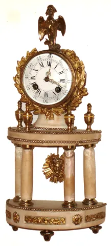 This is a small and ornate 4-column portico case with bright gold detailed castings. The bird on top has spread wings and a long beak wrapped closed. ...