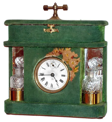 Waterbury Clock Co., Waterbury, Conn., "Plush Toilette" 30 hour cloth covered lady's clock set, c1890