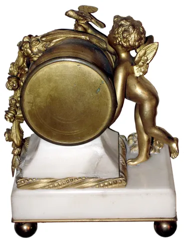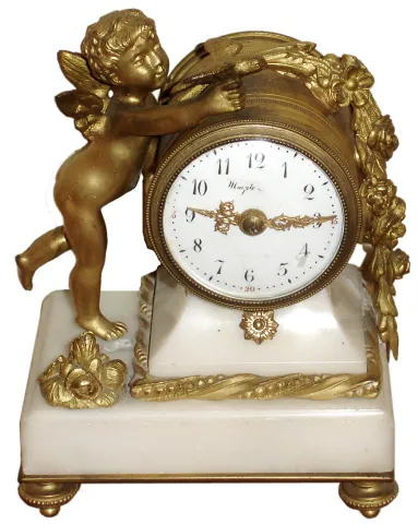 French, miniature figural table clock, 8 day, time only, spring driven movement with a platform cylinder escapement in a white marble case with ormolu cherub grasping dove and other ormolu trim, c1900