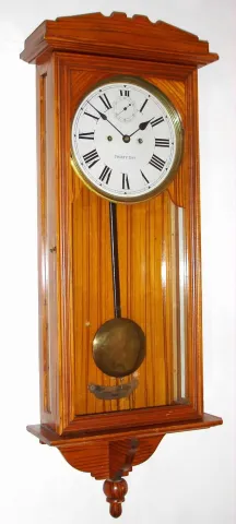 New Haven Clock Co., New Haven, Conn., "Vamoose" wall clock, 30 day, time only, double spring driven movement in grain painted oak case with painted metal dial, c1911