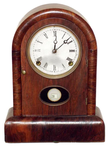 this uncommon little round top clock is in very nice condition with just a few veneer repairs and slightly faded painted metal dial. A good descriptio...