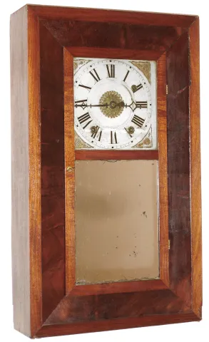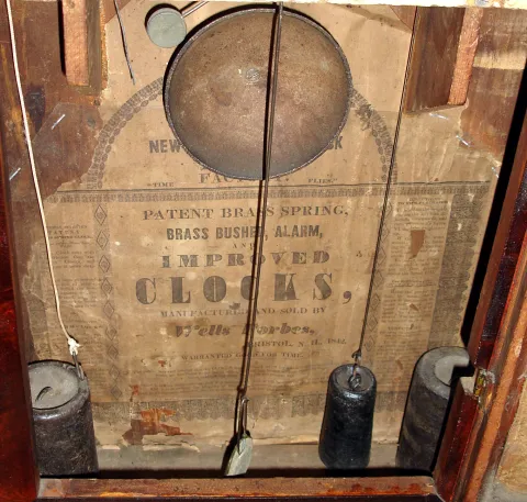 Wells Forbes, Bristol NH, mahogany bevel front time, strike and alarm 30 hour wooden works shelf clock, dated 1842