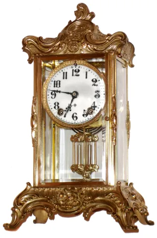 all the cast brass case and pendulum pieces have been brightly polished, and the dial and beveled glasses are in fine condition. Simulated mercury pen...