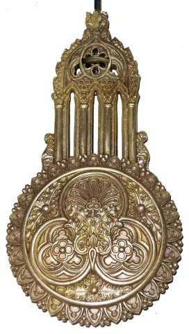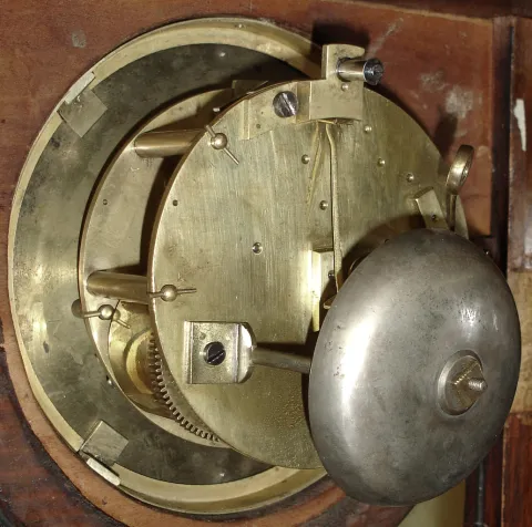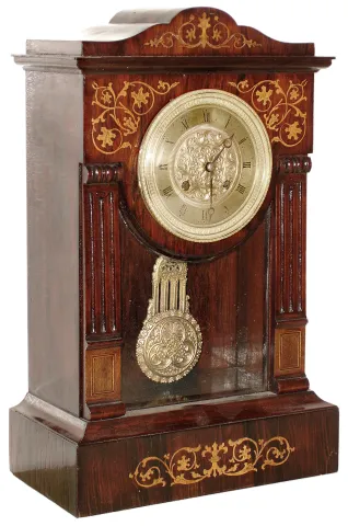 French Empire mantel clock, 8 day, time and bell strike, spring driven movement with knife edge suspension and fancy pendulum in a mahogany with inlay and brass dial with embossed center and fancy cast brass bezel, c1830