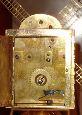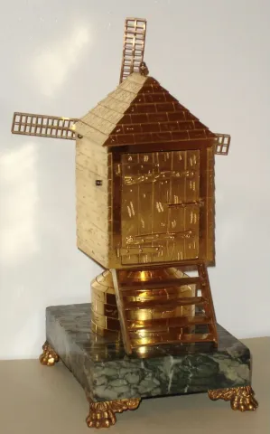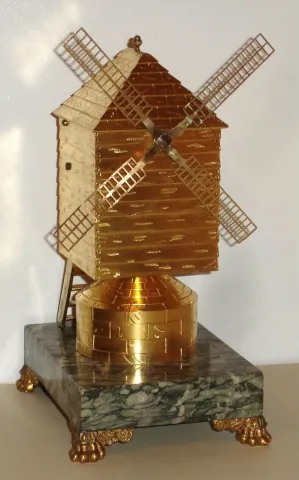 this is not a time piece, only automaton. This is in excellent original condition with minor solder repair on blades of windmill. Ht 11"...