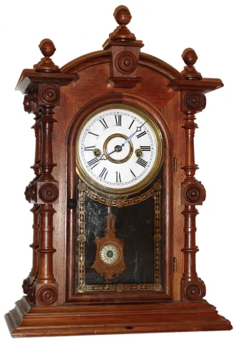 Welch, Spring and Co., Forestville, Conn., "Patti No. 1", 8 day, time and strike, spring driven movement in rosewood and rosewood veneer case with papered metal dial, c1885