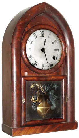 Brewster and Ingrahams, 8 day, time and strike, Kirk's Patent Iron back plate beehive shelf clock, c1845