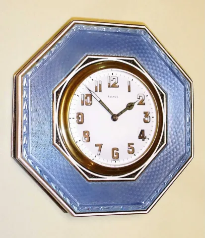Swiss desk clock, 8 day, time only, spring driven movement in powder blue guilloche and white enamel case with Arabic numeral white enamel dial, c1880