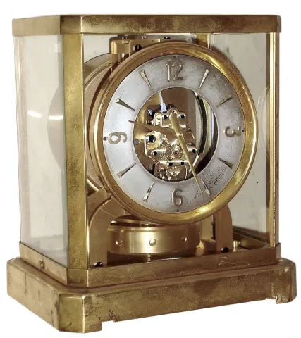 LeCoultre, Switzerland "Atmos", 15J, self winding perpetual running time piece in a brass and glass case, s#32297, c1945