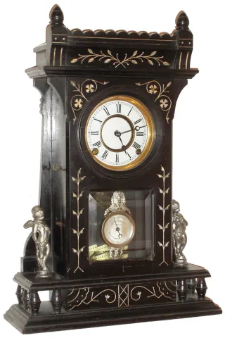 Ebonized case with incised decoration in nice condition in an original finish. There is some loss to the gold in the incised lines. Original porcelain...