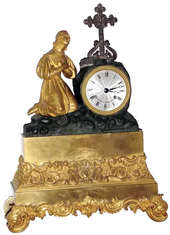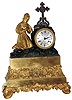 French gilded, 8 day, time and strike, silk suspension figural mantel clock with a figure praying next to a cross. Name found on the dial reads: "Taupin A Romorantin", c1840