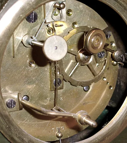 Gilding on the figure and case in nice condition. Engine turned silvered dial is in very good condition. Hands are original. Ht 15"...