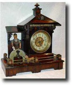 Blacksmith automaton with "blacksmith" at his forge - he strikes the bell on the hour and the 1/2 hour. In oak metal and plaster. German c1890...