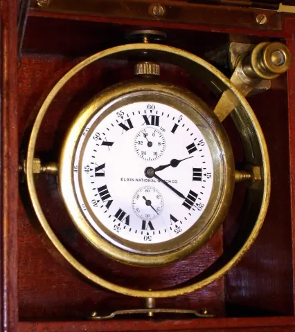 Elgin Watch Co. Father Time deck watch grade 367 with wind indicator 16S 21J, stem wind, lever set, damascene nickel movement with free sprung lever escapement and 2 1/4" Roman numeral porcelain single sunk dial, s#21869703 in gimbaled mahogany box