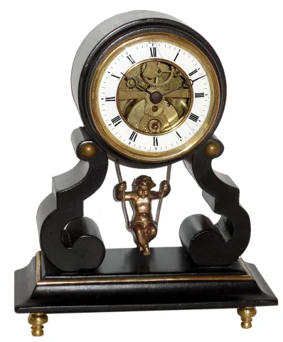 French swinging doll table clock, 8 day, time only, spring driven movement in an onyx case with brass feet and a white enamel chapter ring with exposed movement, c1890