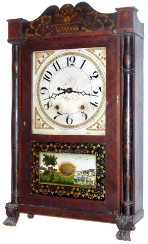 Mahogany veneered case in original finish and stenciling with a couple of veneer chips on the top front edge. Tablet is original with some loss. Dial ...