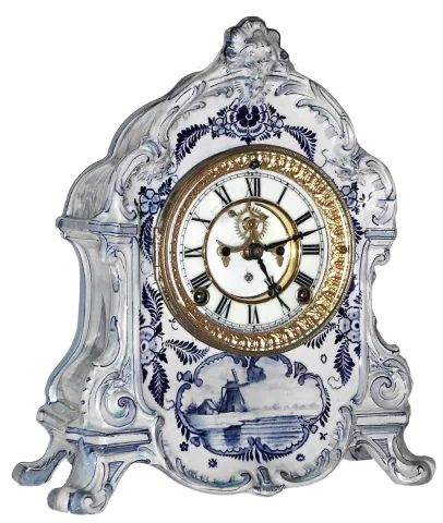 Ansonia Clock Co., New York, Royal Bonn "La Rambla", 8 day, time and strike, Delft style porcelain mantel clock, with open escapement in dial center, c1900