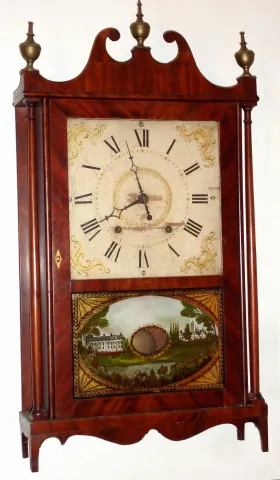 Ephraim Downs, Bristol, Conn., 30 hour time and strike wood movement pillar and scroll shelf clock, c1830