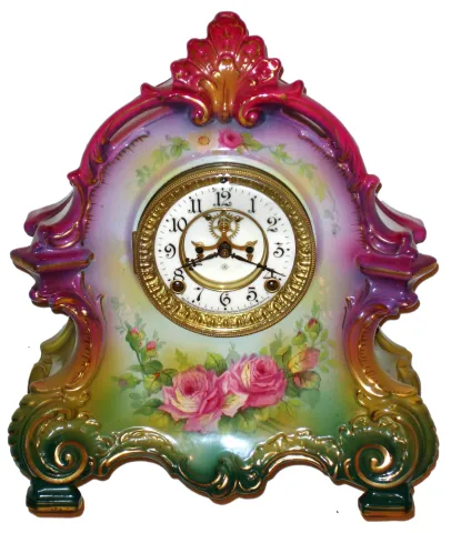 Ansonia Clock Co., New York, Royal Bonn "La Bretagne", porcelain clock, 8 day time and strike spring driven movement, visible escapement, multicolor case, c1915