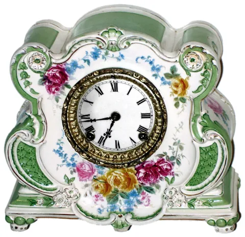 Ansonia Clock Co., New York, Royal Bonn "La Somme" 8 day time and strike porcelain mantel clock, c1900