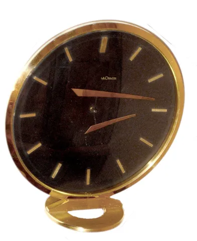 LeCoultre, Switzerland "Floating Hands" desk clock, ref. 425, 8 day, spring driven, Swiss movement in gilt brass and glass circular case with raised baton hands and hour markers with unusual "floating hand" illusion while telling time, c1960