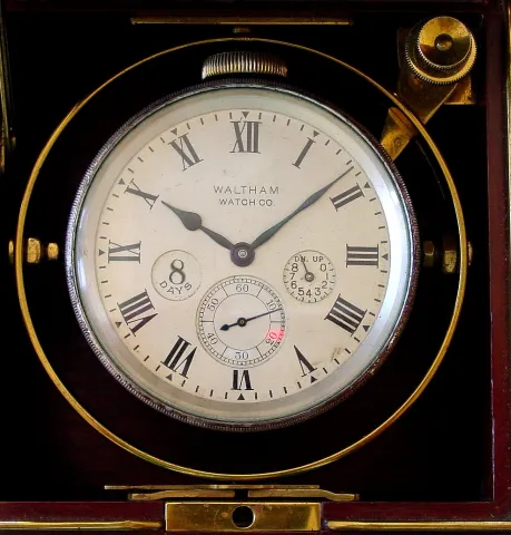 American Waltham Watch Co deck watch, 8 day duration with wind indicator 35S 15J, stem wind, pendant, set, adjusted, damascene nickel movement with lever escapement and Roman numeral silvered metal dial with subsidiary seconds at 6 and an inset "8 DAYS" e