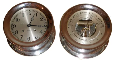 Chelsea Clock Co., Boston, Mass., ship's clock and barometer set, 8 day, time and ship's bell strike, spring driven movement in a nickel plated case with 6" silvered metal dial, s#598257 c1950