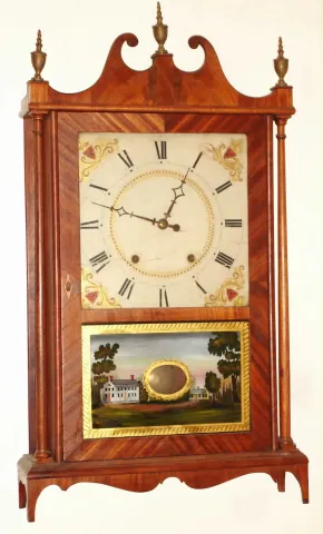 Eli and Samuel Terry, 30 hour time and strike wood movement pillar and scroll shelf clock, c1825
