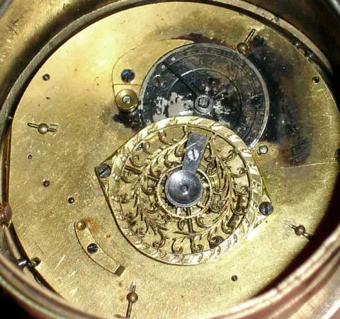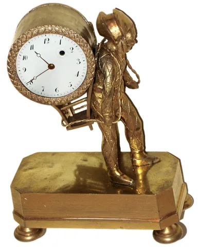 French, Gilt bronze and brass figural timepiece (Frenchman carrying a drum on his back) run by a lever escapement watch movement, c1900.