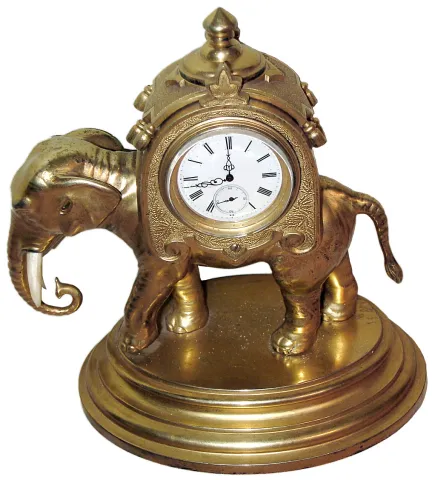French, gilt bronze and brass figural timepiece in the form of an elephant carrying a sedan on his back, run by a lever escapement watch movement.