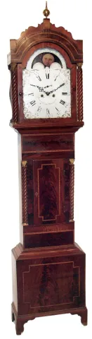 Robert Gibson, Whitehaven, England tall case clock, 8 day, time and strike, weight driven movement in an inlaid mahogany case with rope turned columns flanking trunk and hood. The painted iron dial has moon phase and second's bit, c1820