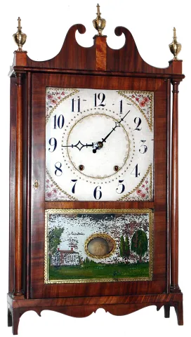 Eli Terry, Plymouth, Conn., pillar and scroll clock, 30 hour, time and strike, weight driven wooden works movement in mahogany veneer case with painted wooden dial and reverse painted lower tablet, c1820