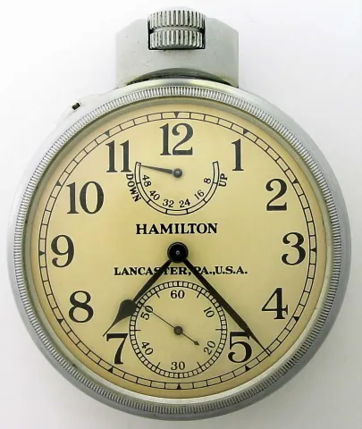 Hamilton Watch Co. Model 22 deck watch with 48 hour wind indicator 35S 21J, stem wind, pin and pendant set, Adj to Temp and 6 pos, parallel line damascene nickel movement with lever escapement and micrometric regulator with Arabic numeral metal dial and b