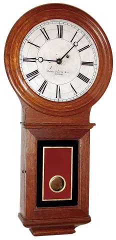 Eastman Clock Co., Boston retailed by Daniel Pratt's Son, Boston wall time piece, 8 day, time only, weight driven movement in an oak case with painted metal dial, serial number 754, c1886
